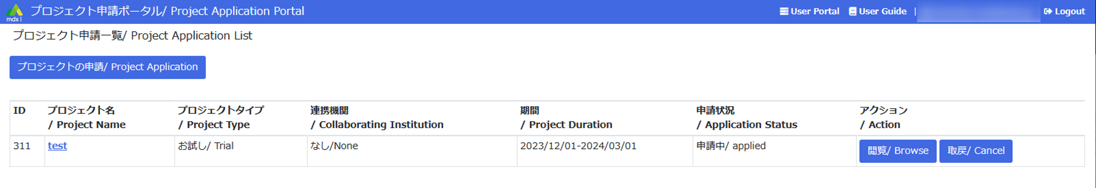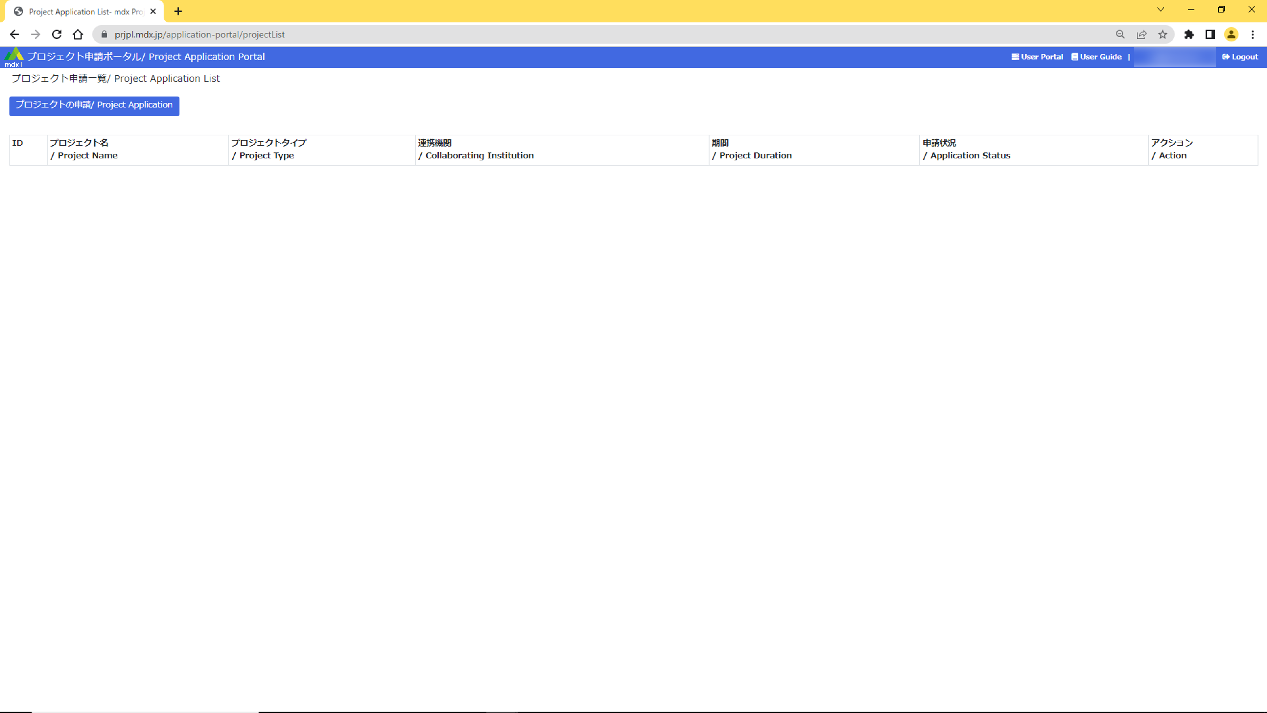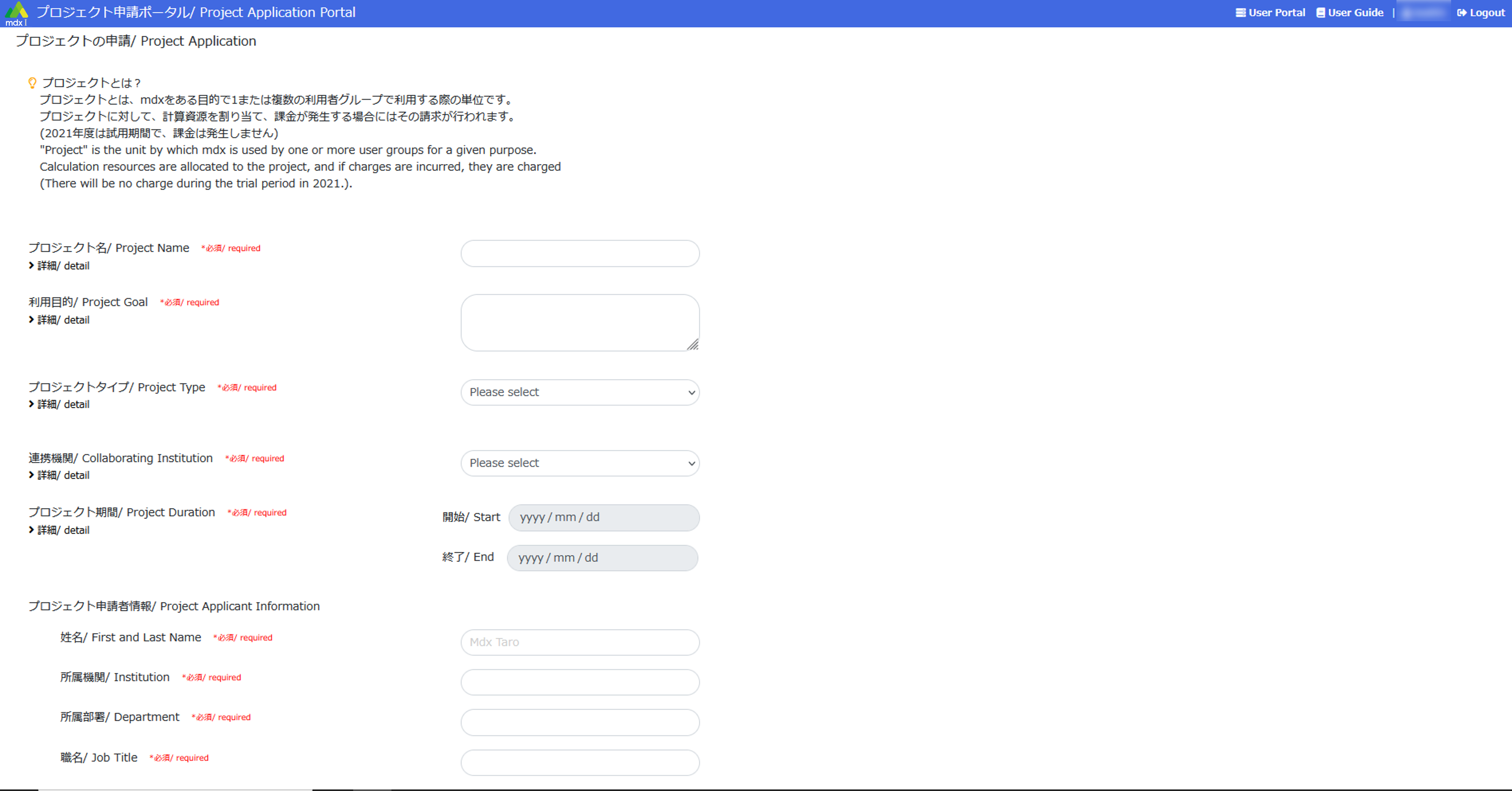 To start using mdx, it is necessary to enter the purpose of use, period of use, and information on each person in charge, and apply (Project application) .