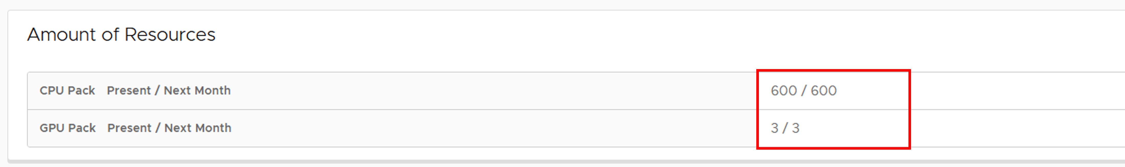 The amount of resources available in 1 CPU Pack and 1 GPU Pack are as follows.